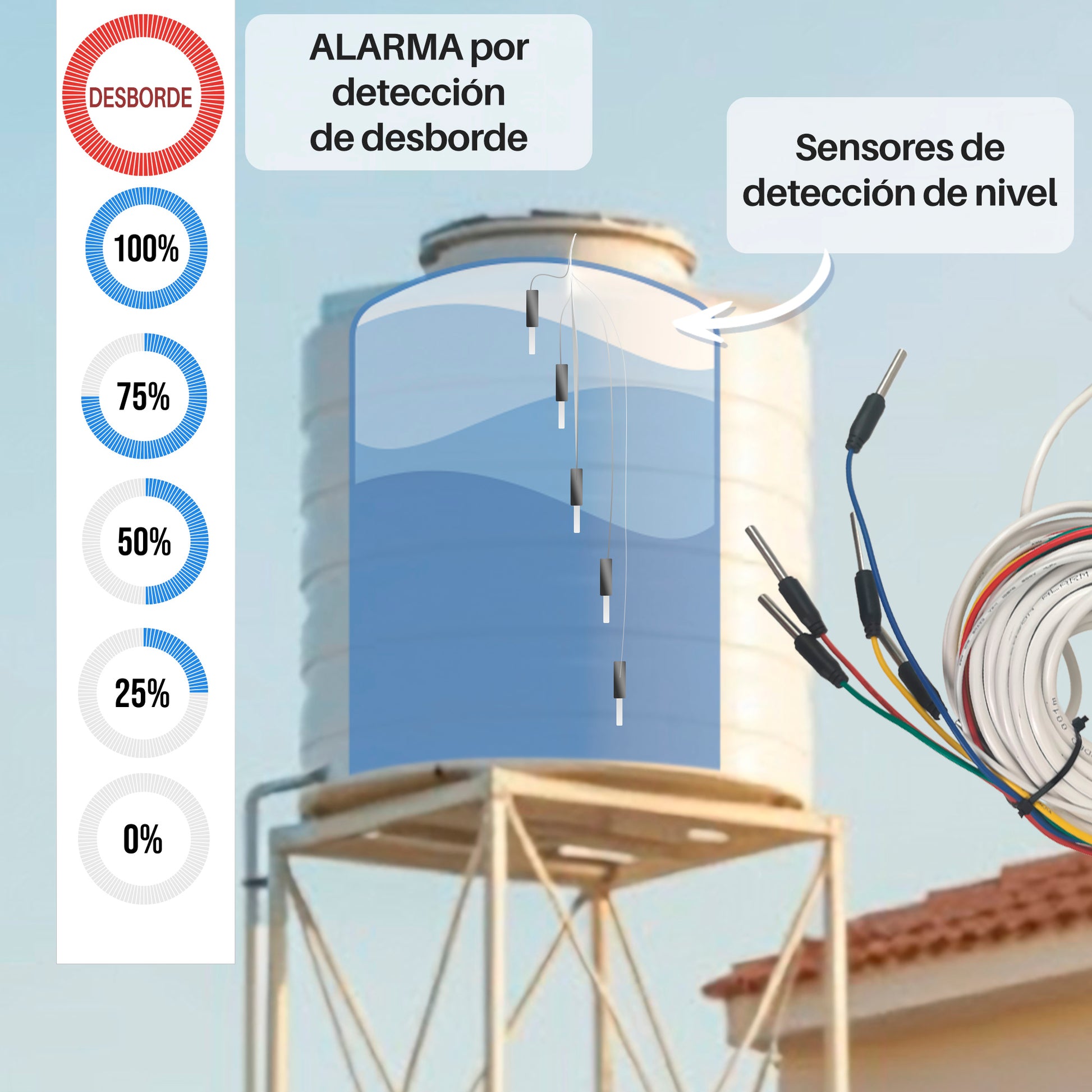 Descripción: Módulo sensor de nivel de agua sin necesidad de conexión WiFi, ideal para tinacos. Detecta el nivel máximo de agua y emite una alarma sonora para evitar desbordamientos.